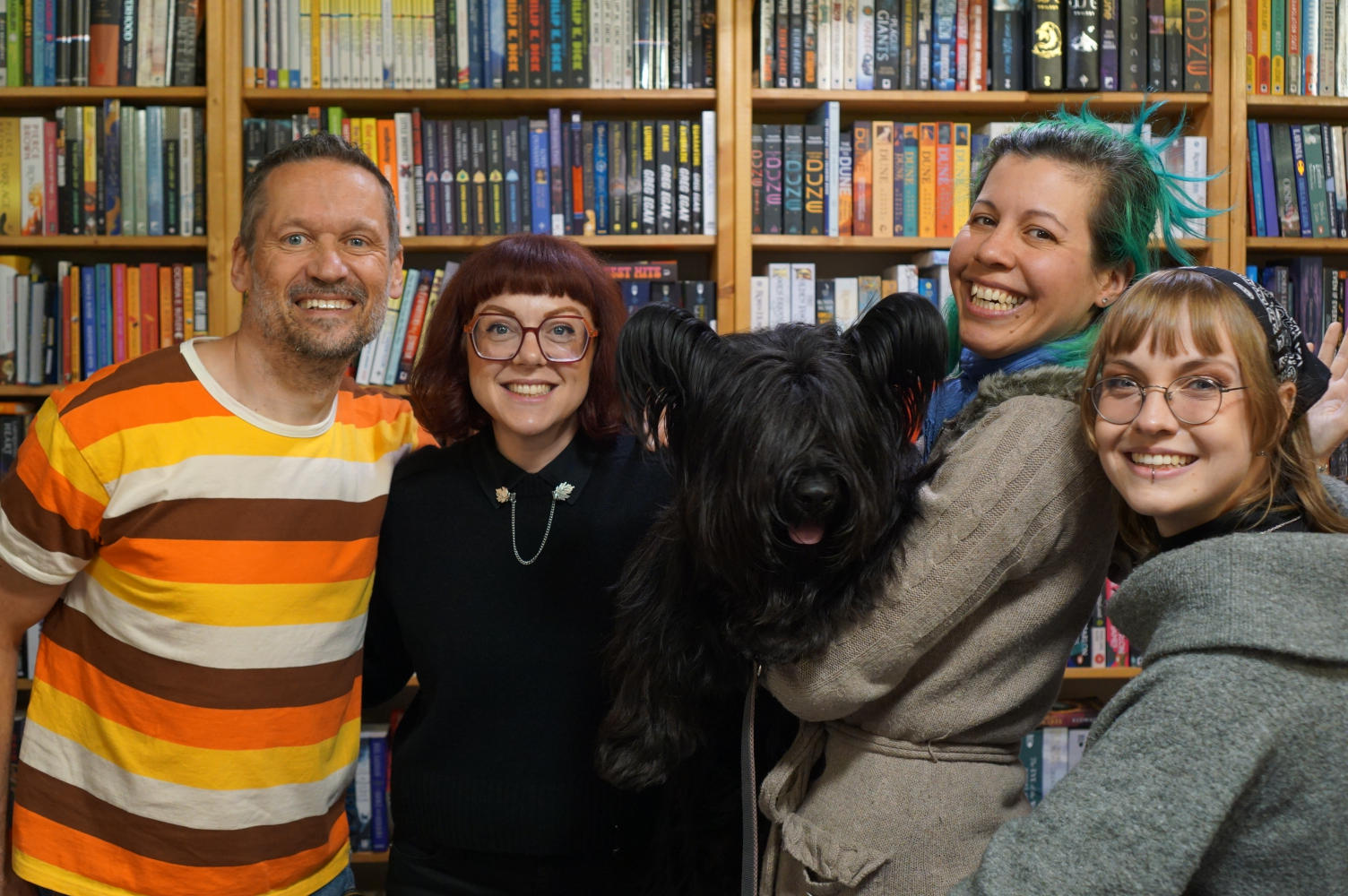 Eine lange Schlange an signierfreudigen Büchern wartete samt ihren menschlichen Trägern in einer langen Schlange im Otherland. Und Schwab ist schnell! Ruckizucki war sie inklusive kleinen Pläuschchen und Selfies mit allem durch und konnte endlich mit Otherland-Hund Skarpi spielen. Auf dem Friedhof ind er Bergmannstraße war sie auch noch kurz. Perfektes Event.